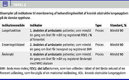 På sygehusene monitoreres kvaliteten af KOL-behandling i ambulatorierne ved registrering af, om der måles lungefunktion, body mass index , åndenød og rygevaner, samt om der tilbydes hjælp til rygestop og rehabilitering (Tabel 1 ). I forbindelse med akutte indlæggelser monitoreres andelen af forløb, hvor man behandler med noninvasiv ventilation (total samt i forhold til respiratorbehandling), og 30-dages-mortalitet. Fra almen praksis indberettes nu tilsvarende data fra KOL-årskontrollen, hvor man monitorerer de samme parametre som i ambulatorierne suppleret med forebyggende tiltag, f.eks. influenzavaccination.