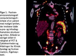 Klinisk fysiologi og nuklearmedicin er et speciale, hvori man udvikler og anvender metoder særligt med henblik på funktionsdiagnostik og bygger på indgående kendskab til blandt andet patofysiologi, strålebiologi og kinetik. En række metoder er i Danmark blevet opfundet, udviklet og valideret inden for specialet og videreformidlet til relevante kliniske og parakliniske afdelinger. Disse omfatter de tidligste spæde forsøg på detektion af stråling fra indgivne radioaktive lægemidler over nyrer, hjerne, lever og hjerte til oprettelse af kredsløbslaboratorier, introduktion af og medvirken til udvikling af ekkokardiografi, ultralyd- og Doppler-undersøgelser og magnetisk resonans-billeddannelse. I den seneste dekade har vi været vidne til en nærmest eksplosiv udvikling inden for single photon emission computerised tomography (SPECT) og positronemissionstomografi (PET) alene eller i kombination med computertomografi (CT). Således har man med PET med F-18-mærket deoxyglukose i de seneste år revolutioneret diagnostikken og stadieinddelingen for mange typer kræftsygdomme (Figur 1 ). Danmark er således med i front med PET og SPECT til klinisk brug med en meget høj tæthed af gammakameraer og cyklotroner. Især inden for kardiologisk og onkologisk diagnostik har disse teknikker vundet indpas. Antallet af og behovet for avancerede billedfusionsdannende gammakameraer i Danmark er stadigt stigende. Ud over funktionsdiagnostik varetager man i specialet i tæt samarbejde med de kliniske afdelinger radioterapi af udvalgte sygdomme overvejende radioiodterapi af benigne thyroideasygdomme. Hertil kommer en forventet stigning i specialbehandling af endokrinologiske og maligne lidelser med særligt fremstillede isotoper og radioaktive lægemidler. Forskning og udvikling udgør et væsentligt element i specialets identitet, og i de seneste 25 år har vi været vidne til en betydelig forskningsproduktion omfattende mere end 1.500 videnskabelige arbejder, 100 doktordisputatser og et tilsvarende antal ph.d.-afhandlinger. Forskningsområderne har især været hjerne-, hjerte-, perifer kredsløbs- og nyrefysiologi, leverens hæmodynamik og metabolisme, idræts- knogle- og arbejdsfysiologi samt onkologi. På universitetsniveau er der inden for specialet universitetsprofessorater, forskningsprofessorater og forskningslektorater. Som nylig meldt til Sundhedsstyrelsen vil der være behov for etablering af en række nye lægestillinger i takt med den øgede efterspørgsel på specialets ydelser fra de i alt 21 afdelinger.