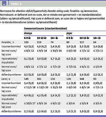 De normative data fordelt på køns- og aldersgrupper er vist i Tabel 3 . Resultaterne er inddelt i de tre symptomområder: uopmærksomhed, hyperaktivitet/impulsivitet og adfærdsproblemer. Scoren er opgivet med gennemsnit, standardafvigelse og tærskelværdier for henholdsvis »normal scorer« (mindre end gennemsnit + en standarddeviation (SD)) og »høj scorer« (større end gennemsnit + to SD) for både forældre- og lærerbesvarelser.