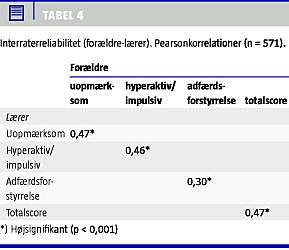 Overensstemmelsen mellem forældre- og lærerbesvarelserne bedømt med Pearsonkorrelation er signifikant med koefficienter på 0,47 og 0,46 vedrørende scoring af de to kernesymptomområder, hvorimod den er lavere, men stadig signifikant (0,30) for scoring af adfærdsforstyrrelsessymptomer (Tabel 4 ).