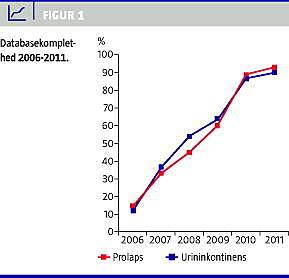 Databasekompletheden er steget over tid, (Figur 1 ). I 2010 var databasekompletheden for inkontinens 93% for offentlige sygehuse versus 23% for private (p < 0,0001) og for prolaps hhv. 93% og 22% (p < 0,0001). Efter debat i bl.a. Ugeskrift for Læger er kompletheden for de offentlige og private sygehuse øget til hhv. 95% og 44% for inkontinens og 93% og 35% for prolaps [1].Validiteten af de indberettede data er i et igangværende ph.d.-studie påvist at være særdeles god, både for administrative og kliniske data. Der er p.t. udvalgt syv indikatorer, som dækker både læge- og patientrapporterede kvalitetsmål. I 2011 var standarden for tre af de syv indikatorer opfyldt [2]. For tre indikatorer var standarden tæt på at være opfyldt, og for én indikator (ventetid fra henvisning til første ambulante besøg) har standarden i hele perioden været langt fra at være opfyldt. Det er interessant og væsentligt, at standarden for subjektiv patientbedømmelse af succes er opfyldt for både inkontinens (70% (95% sikkerheds-interval (SI): 67-74%) og prolaps (81% (SI: 79-83%)).