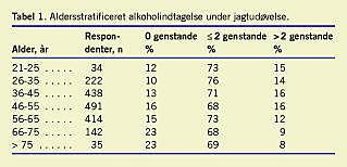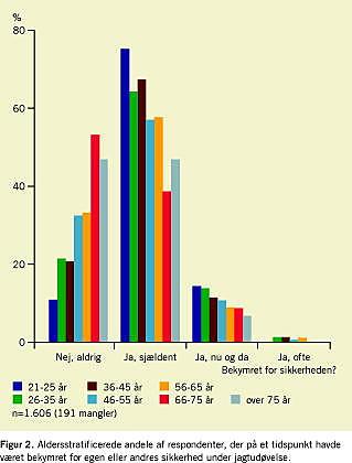Resultater: Mere end to ud af tre (70%) jægere havde på et tidspunkt under jagt oplevet bekymring for egen eller andres sikkerhed. Blandt de 21-25-årige havde ni ud af ti (91%) haft mindst en sådan oplevelse. Der var en signifikant (p < 0,001) alderssammenhæng. Henholdsvis 78% og 82% af jægerne anvendte aldrig høreværn respektive beskyttelsesbrille under jagt. 57% af jægerne anvendte OBV rutinemæssigt under jagt. Vedrørende alkoholforbrug indtog 86% to genstande eller mindre under jagt.