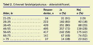 Af de 1.797 inkluderede respondenter var 1.765 (99%) mænd og 24 (1%) kvinder. (otte ubesvaret). Aldersfordelingen, der var gausisk, fremgår af Figur 1 . Kvindernes gennemsnitsalder (42,4 år, standarddeviation (SD): 10,7 år) var signifikant (p< 0,05) lavere end mændenes (49,6 år, SD:12,5). Den relative andel af det samlede antal besvarelser fordelt på de fem landsregioner og korrigeret for antal indbyggere var ligeligt fordelt, bortset fra Region Hovedstaden, der lå 11% under gennemsnittet for de øvrige regioner. Gennemsnitsalderen ved erhvervelse af jagttegn var 20,8 år (SD: 7,9 år). 70% (1.258) (ni ubesvaret) af respondenterne havde haft jagttegn i mere end 20 år. 29% (syv) af kvinderne var vant til at omgås skydevåben, inden de erhvervede jagttegn, mod 61% (1.081) (fem ubesvaret) af mændene. 70% (1.232) af respondenterne svarede, at de gik på jagt mere end ti gange årligt. 80% (1.419) (11 ubesvaret) af respondenterne opbevarede hjemme deres skydevåben i et godkendt våbenskab (lovpligtig opbevaring af skydevåben i et godkendt våbenskab blev indført den 1. januar 2003). 78% (1.397) brugte aldrig høreværn under jagt. 82% (1.480) anvendte aldrig beskyttelsesbriller (egne briller ikke medregnet) under jagt. 57% (1.030) anvendte altid OBV. Med hensyn til alkoholindtagelse under jagtudøvelse indtog 86% (1.536) to genstande eller derunder. 14% (248) svarede, at de under jagt indtog mere end to genstande. Kvinder indtog signifikant (p < 0,05) mindre alkohol end mænd under jagtudøvelse. Ingen kvinder indtog over to genstande under jagt. 29% (syv) af kvinderne indtog slet ikke alkohol under jagtudøvelse mod 15% (263) af mændene. Alkoholindtagelsen stratificeret efter alder fremgår af Tabel 1 . 70% (1.126) (191 ubesvaret) af respondenterne svarede ja til, at de på et tidspunkt havde været bekymret for egen eller andres sikkerhed under jagtudøvelse. Heraf havde 1% (11) ofte været bekymret, 15% (168) havde nu og da været bekymret, og 84% (947) havde sjældent været bekymret. 30% (480) af respondenterne svarede at de aldrig havde været bekymret for egen eller andres sikkerhed. Der var en signifikant (p < 0,001) sammenhæng imellem alder og bekymring for sikkerhed, således at de yngre jægere i højere grad end de ældre jægere havde oplevet situationer, hvor de havde været bekymret for egen eller andres sikkerhed (Figur 2 ). På spørgsmålet om, hvorvidt respondenten tidligere havde gennemgået et førstehjælpskursus og var i besiddelse af et godkendt førstehjælpsbevis svarede 70% (1.248) ja og 30% (543) nej (seks ubesvaret). Der var en signifikant (p < 0,001) alderssammenhæng således, at jo yngre respondenterne var, jo flere havde erhvervet førstehjælpskursus (Tabel 2 ). 75% (18) af de kvindelige mod 40% (701) (18 ubesvaret) af de mandlige respondenter svarede ja til indførelse af førstehjælp som obligatorisk element i forbindelse med erhvervelse af jagttegn. 50% (12) af de kvindelige respondenter mod 28% (490) (23 ubesvaret) af de mandlige svarede, at de ville føle sig mere tilpas under jagtudøvelse, hvis jagtdeltagerne havde et basalt førstehjælpskursus.