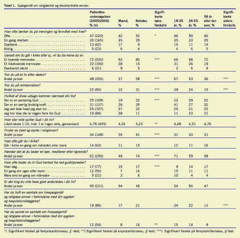 I Tabel 1 ses fordelingerne af svar på spørgsmålene om eksistentiel tænkning og religiøsitet i patienttroundersøgelsen. I tabellen er der angivet, hvornår der er signifikante alders- eller kønsforskelle i svarfordelingerne. Der ses signifikante forskelle på svarfordelingen hos de to køn. I alle disse tilfælde var det kvinderne, der var mest religiøse, havde haft flest eksistentielle tanker, havde flest trosforestillinger og havde den højeste grad af religiøs adfærd. Signifikante aldersforskelle blev fundet tre steder, og her var det den yngste patientgruppe (under 36 år), der adskilte sig fra de øvrige aldersgrupper. De yngre havde oftere efterlivsforestillinger i en eller anden form. 67% af de unge under 36 troede på et liv efter døden. 80% af de kvindelige patienter og 57% af de mandlige i gruppen under 36 år angav at bede eller meditere.