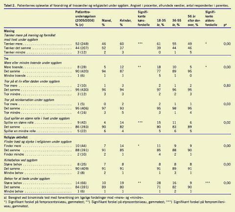 I Tabel 2 er sammenfattet de spørgsmål, der omhandlede patienternes egne oplevelser af ændringer i religiøsitet og eksistentielle tanker i forbindelse med deres sygdom og hospitalsindlæggelse. Spørgsmålene er i tabellen sammenfattet i hovedkategorier, og det ses, at over halvdelen af patienterne angav at tænke mere over meningen og formålet med livet under deres sygdom og hospitalsindlæggelse. Der er på dette spørgsmål signifikante køns- og aldersforskelle. Der er flest kvinder og flest yngre, som tænker mere på meningen med livet under sygdom og hospitalsindlæggelsen (60% af kvinderne over for 46% af mændene p = 0,004, gammaværdi: -0,251 og 61% af gruppen under 36 år over for 49% af gruppen over 55 år p = 0,029, gammaværdi: 0,178)