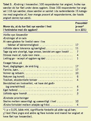 I Tabel 3 ses det, at 50% af patienterne angav at have fundet nye livsværdier i forbindelse med deres sygdom. Det blev i spørgeskemaet foreslået at angive disse nye værdier med stikord, og 100 personer valgte at angive i alt 118 nye værdier, og disse er samlet i kategorier i Tabel 3. Som det ses, ændres både psykologiske forhold og eksistentielle værdier.