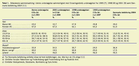 Stikprøvens sammensætning med hensyn til køn, alder og geografisk fordeling var repræsen tativ i forhold til landets samlede voksne befolkning, dog var der en lille overrepræsentation af kvinder og en underrepræsentation af 15-24-årige. Populationernes sammensætning i de fire undersøgelsesår var ikke helt identiske (Tabel 1 ), og som tidligere blev resultaterne derfor også opgjort efter køn og alder [10].