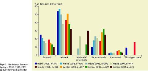 Forbrugsfrekvensen af mælk er faldet, men udviklingen i valg af mælketype følger tendensen i den foregående periode, idet der ses et fortsat fald i forbruget af sød- og letmælk og en stigning i forbruget af mælk med 0,5% fedtindhold (minimælk) (Figur 1 ). I denne periode er der dog for første gang set et fald i forbruget af skummetmælk, men samlet er der sket en stigning i andelen, som vælger fedtfattige mælketyper fra 31% til 44% for mændenes vedkommende og fra 45% til 55% for kvindernes vedkommende [10].