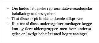 Der findes flere undersøgelser af seksuelle dysfunktioner hos danskere. Alle undersøgelserne har dog fraset én metodologiske mangler, og denne ene undersøgelse er foretaget på et lille materiale. Der er således usikre oplysninger om prævalensen af seksuelle dysfunktioner i den danske befolkning. Internationalt set er billede dog ikke meget bedre. I en oversigtsartikel fra 2001 konkluderede forfatterne, at man på baggrund af undersøgelser i almene befolkninger kunne skønne prævalensen af mandlig manglende lystfølelse samt om orgastisk og erektiv dysfunktion, hvorimod der ikke kunne udregnes sikre prævalenser for de øvrige dysfunktioner (39). Ud fra et medicinsk synspunkt er det værdifuldt at få vurderet forekomsten af seksuelle dysfunktioner i et epidemiologisk perspektiv med undersøgelser, der kan leve op til de metodologiske krav, man i dag stiller.