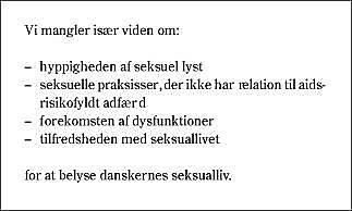 Følgende områder er bedst belyst ved de nuværende undersøgelser: seksualoplysning, samlejedebut, samlejefrekvens, antal partnere samt seksuelle praksisser, der har relation til risikoadfærd i forbindelse med aids, mens bl.a. seksuel lyst er meget dårligt belyst. Ud over at de to undersøgelser vedrørende seksuel tilfredshed peger på, at seksuallivet har en sundhedsmæssig betydning, ved man, at mange facetter ved seksuallivet har betydning for opståen og oplevelsen af seksuelle dysfunktioner, og derfor har viden om danskerne seksualliv også medicinsk interesse. Der synes således at være behov for en repræsentativ, national undersøgelse af danskerne generelle seksualliv, en undersøgelse, der lever op til nutidens metodologiske krav.