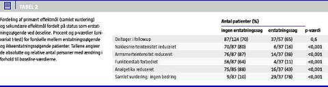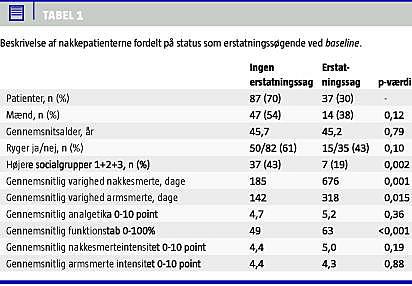 I alt 1.243 lænde- og 202 nakkepatienter blev inkluderet. Af pladshensyn er kun data for nakkepatienterne vist i Tabel 1 og Tabel 2 . Sammenfattende viste resultaterne: