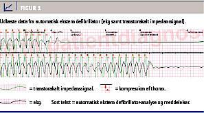Siden implementeringen af AED er der systematisk opsamlet data fra hjertestop, hvor en AED har været anvendt. Efter genoplivning med AED skiftede teknisk afdeling apparatets batteri og elektroder og informerede en projektsygeplejerske, som udlæste data fra AED til programmet CODE-STAT 9.0 (Physio-Control, Redmond, WA, USA). Data omfattede information om tider, defibrillering, et elektrokardiogram og transtorakal impedans. Den transtorakale impedans ændrer sig under hjertemassage og ventilation, hvorved der indirekte opnås information om hjertemas-sagen, herunder frekvens, antal og varigheden af pauser samt ventilationsfrekvens (Figur 1). Impedansdata giver ikke information om trykdybde eller tidalvolumen [4].