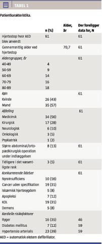 I studieperioden var der 77 AED-batteriskift. Ved efterfølgende kontakt til telefonomstillingen og sengeafdelinger samt ved gennemgang af journaldata blev der fundet syv alarmeringer, hvor der ikke var hjertestop. Herudover var der ni tilfælde, hvor det ikke lykkedes at fremskaffe persondata og/eller AED-data. Der forelå dermed data fra 61 hjertestop, med komplette AED- og journaldata på 46 (75%) patienter. Alene journaldata forelå på fem (8%) patienter. På ti (17%) patienter forelå der inkomplette AED-data, dvs. responstid og ét elektrokardiogram for hver rytmeanalyse, men ingen impedansdata pga. tekniske fejl i forbindelse med dataregistrering. Patientkarakteristika er vist i Tabel 1. I Tabel 2 ses data fra hjertestopbehandlingen.