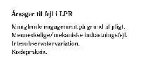 Data fra de enkelte hospitaler indberettes månedligt til LPR og kontrolleres umiddelbart for fejltastninger og diskrepans, også på tværs af de indberettede data. Indberetningerne er obligatoriske, og denne form for pligtregistrering nedsætter ofte validiteten. Særlig diagnose- og operationskoder er udsat, idet korrekt og komplet registrering kræver, at lægen kender den enkelte patients forløb og behandling. Nedsat troværdighed kan også skyldes simple menneskelige/mekaniske registreringsfejl; op til 10% fejlregistreringer/manglende registreringer må forventes (6). Interobservatørvariationen ved diagnose- og operationskoderne er en tredje faktor, idet denne kan være op til 87%, afhængig af antallet af diagnosemuligheder og specificiteten af de diagnostiske kriterier (7, 8). Endelig kan der være forskel på de enkelte hospitalers kodepraksis, hvilket kan påvirke såvel administrative som sygdomsmæssige oplysninger (boks 1).