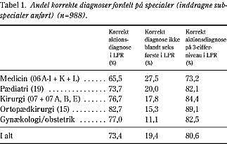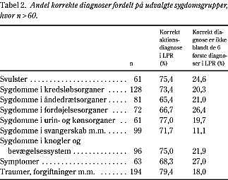 Diagnoseoplysninger blev delt op på fem specialer: Medicin, kirurgi, gynækologi/obstetrik, ortopædkirurgi og pædiatri, idet alle ikke-sygdomsdiagnoser blev fjernet (fx rask nyfødt barn). Den korrekte aktionsdiagnose (ICD-10) var samlet anført for 73,4% af patienterne, hvilket dækkede over en variation på 65,5% for medicinske patienter og 82,7% for ortopædkirurgiske patienter ( Tabel 1 ). I gennemsnit havde 19,4% af patienterne ikke fået anført den korrekte diagnose blandt de seks først anførte diagnosekoder. Tabel 2 viser fordelingen på sygdomsgrupper - typiske kirurgiske diagnoser ligger bedst.