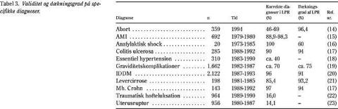 Den seneste brede undersøgelse af validiteten i LPR er fra 1993, men der er lavet flere mere specifikke opgørelser siden.Tabel 3 viser de fundne undersøgelser. Validiteten er meget svingende (14,1-97%), medens dækningsgraden generelt er god. Dette genfindes ved sammenligninger af LPR og mindre, sygdomsspecifikke registre. Således er der lavet samkøring af LPR og henholdsvis Registeret over Legalt Provokerede Aborter (RLPA), Register for spastisk lammelse samt Hjerteregisteret. I alle tilfælde var der en del indgreb registreret i LPR, som ikke kunne genfindes i det specifikke register, men kun en mindre del som manglede i LPR (3,7% med hensyn til RLPA) (15, 24, 25). Validiteten af hysterektomiproceduren er undersøgt for en enkelt afdeling. Her blev fundet god sammenhæng mellem LPR og operationsprogrammet (26). Blandt 359 journaler på abortpatienter blev fundet korrekte administrative data hos 92-100% (14).