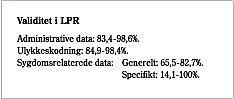 Der bliver løbende lavet validitetsundersøgelser af LPR, også af LPR selv. Den nyeste undersøgelse er publiceret i 1993, og her udtog man 1.094 tilfældigt udvalgte journaler fra patienter udskrevet i 1990. Journalerne blev gennemgået og kodet om, og resultatet sammenlignet med det allerede indkodede i LPR, såvel med hensyn til administrative som sygdomsrelaterede data (10, 11). Ved gennemgang af journalerne blev tvivl/fortolkningsspørgsmål afgjort til LPR's fordel.