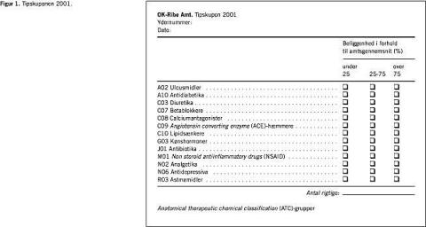 Tipskuponen omfatter 13 lægemiddelgrupper på andet ATC-niveau (Figur 1 ). De udvalgte 13 lægemiddelgrupper dækker 80-90% af al lægemiddelordination i almen praksis. Besøget blev indledt med, at man i hver praksis - efter omhyggelig instruktion - udfyldte en tipskupon ud fra en formodning om praksis' ordinationsniveau i forhold til amtsvariationen. I flermandspraksis med samme ydernummer blev tipskuponen udfyldt i fællesskab. Amtgennemsnittet blev defineret som området mellem 25%- og 75%-fraktilerne, under amtsgennemsnittet som området mellem 0%- og 25%-fraktilerne og over amtsgennemsnittet som området mellem 75%- og 100%-fraktilerne. Efter udfyldelse af tipskuponen blev hver enkelt af de 13 ATC-grupper gennemgået og praksis' eksakte beliggenhed i forhold til amtsvariationen blev aflæst i OPS-2000. Antallet af »rigtige« svar inden for de 13 lægemiddelgrupper blev herefter opgjort.