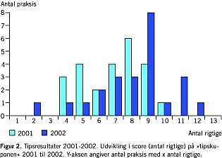 I alt 25 ud af 26 (96%) mulige praksis deltog i KOAP-projektet, det svarer til 35 ud af 36 praktiserende læger (97%). Antallet af korrekte placeringer på tipskuponen steg signifikant fra 6,9 i 2001 til 8,1 i 2002 (p < 0,05) (Figur 2 ).