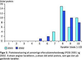 De praktiserende lægers evaluering af PEB/OK-ordningens besøg i hhv. 2001 og 2002 fremgår af Figur 3 . Gennemsnitskarakteren (på en skala fra 1 til 10) var 8,6 i både 2001 og 2002.