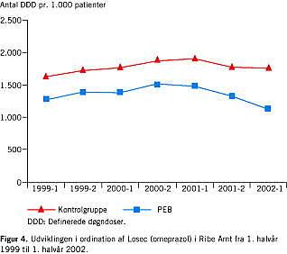 Ved sammenligning af ordinationsdata fra 1. halvår 2001 (sidste halvårsperiode før den første besøgsrunde) og 1. halvår 2002 (første halvårsperiode efter afslutningen af den første besøgsrunde) fandt vi, at forbruget (målt i DDD) af den dyreste protonpumpehæmmer Losec (omeprazol) faldt 24% (fra 1.480 DDD pr. 1.000 patienter til 1.132 DDD pr. 1.000 patienter) (p < 0,05) hos de besøgte læger mod et fald på kun 8% i kontrolgruppen (fra 1.911 DDD pr. 1.000 patienter til 1.758 DDD pr. 1.000 patienter) (p < 0,05) (Figur 4 ).