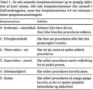 I 1999 opstillede vi ved hjælp af Delfi-metoden et forslag til en tjekliste for praktiske kliniske færdigheder i den prægraduate lægeuddannelse (2). Et ekspertpanel på 52 danske læger opnåede via to delvis anonymiserede spørgeskemarunder 75%'s konsensus om minimumskravene til 212 praktiske kliniske færdigheder for en nyuddannet læge. Panelet var bredt sammensat af læger med ansvar for og engagement i grunduddannelsen, bredde i specialerne samt geografisk spredning, og inkluderede desuden tre yngre læger og tre lægestuderende. I undersøgelsen anvendte vi seks kompetenceniveauer defineret som vist i Tabel 1 . Panelet udskød opnåelse af kompetenceniveau 5 (rutine) til turnusuddannelsen og fordelte de 212 færdigheder næsten ligeligt mellem kompetenceniveauerne 4 (selvstændighed), 3 (supervision) og 2 (observation). Tolv færdigheder blev fastlagt til kompetenceniveau 1 (principkendskab), og tre blev fundet irrelevante for lægestuderende.