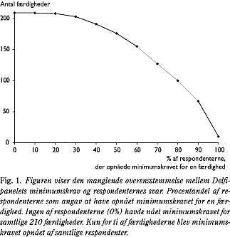 Fig. 1 viser den procentdel af respondenterne, som angav at have opnået minimumskravet for en færdighed. Ingen af respondenterne opnåede minimumskravene for samtlige 210 færdigheder. Der var kun ti færdigheder, hvor minimumskravet blev opnået af samtlige respondenter. For eksempel blev 100 af færdighederne opnået af 80% af respondenterne.