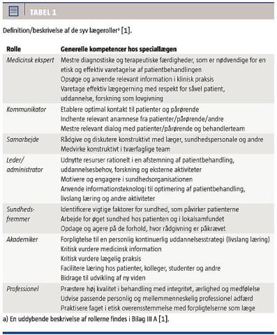 Tabel 1 [1]. I CanMEDS er rollen medicinsk ekspert den primære rolle, og de andre seks er støtteroller [2], og rollerne blev symboliseret ved blomsten, som ses i Figur 1. Speciallægekommissionen definerede derimod den generelle kompetence hos en speciallæge som: »Evnen til at mestre en flerhed af roller og egenskaber – lægefaglige teknikker, pædagogik, ledelse, kommunikation, samarbejde mv.« [1]. I denne definition skelnes ikke mellem vigtigheden af de syv roller – de er ligeværdige.