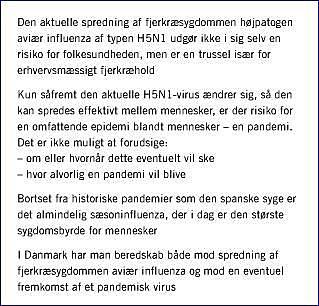 Den aktuelle spredning af fjerkræsygdommen højpatogen aviær influenza H5N1 er uden fortilfælde. Spredning af en fjerkræsygdom udgør ikke i sig selv en pandemisk trussel. Først i det øjeblik, virus begynder at tilpasse sig andre værter, herunder naturligvis især mennesker, vil risikovurderingen i forhold til pandemitruslen ændres til det mere alvorlige. Så længe dette ikke er sket, er aviær influenza og pandemisk influenza at betragte som to adskilte sygdomme. Blandt de tre influenzasygdomme tegner sæsoninfluenza sig i vore dage samlet for den største sygdomsbyrde blandt mennesker [2].