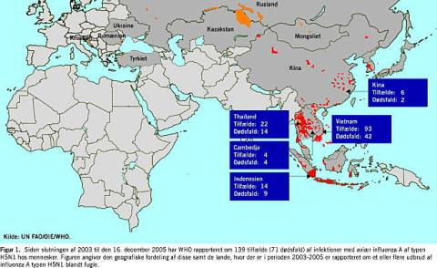 I sjældne tilfælde kan et højpatogent fugleinfluenzavirus give sygdom hos de personer, der har haft kontakt med det syge fjerkræ. Dette er for eksempel set i forbindelse med bekæmpelsen af udbruddet af fugleinfluenza af typen H7N7 i Holland i 2003 [5]. Det er også beskrevet i forbindelse med de meget massive aktuelle udbrud af H5N1. WHO rapporterede 16. december 2005 om i alt 139 smittede personer, hvoraf 71 var døde (Figur 1 ) (se opdateringer på www.who.int/csr/en/). Set i forhold til det meget store antal smittede fugle, og den massive udsættelse for smitte, der har været tale om, er der samlet tale om meget få sygdomstilfælde blandt mennesker. Der har for eksempel ikke været konstateret smitte blandt de mange personer, der har deltaget i bekæmpelsen af fjerkræsygdommen i Asien.