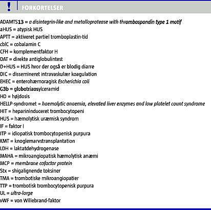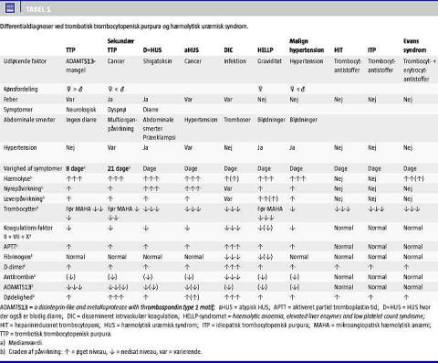 TTP og HUS ligner hinanden mht. hæmolysen og trombycocytopenien, men adskilles ved graden af nyrepåvirkning og neurologiske symptomer (Tabel 1 ). Hos nogle patienter udløses TMA primært af en enkelt faktor (f.eks. hereditær ADAMTS13-mangel, E. coli O157:H7, eller behandling med mitomycin), men hos mange patienter udløses TMA formentlig af en kombination af flere af de oven for beskrevne faktorer. Dette resulterer i klinisk overgangsformer mellem de forskellige syndromer. Derfor kan det i praksis være svært/umuligt at skelne TTP og D+HUS/aHUS, hvilket også er årsagen til, at der ikke er en entydig klassifikation af sygdommene.