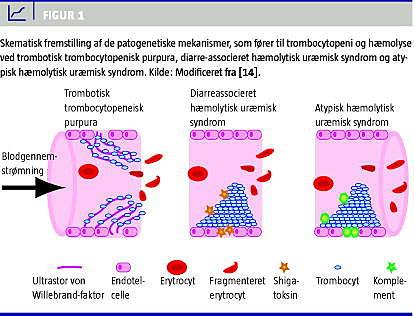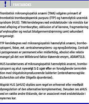 De trombotiske mikroangiopatier (TMA) er en gruppe klinisk patologiske syndromer, der er karakteriseret ved tromboser i organernes mikrovaskulatur, forbrugsbetingettrombopeni og mekanisk betinget ødelæggelse af erytrocytterne og som følge heraf skistocytose i det perifere blod [1]. Hovedgrupperne udgøres af trombotisk trombocytopenisk purpura (TTP) og hæmolytisk uræmisk syndrom (HUS). Centralt for udviklingen af TMA er beskadigelse af endotelcellerne, der efterfølgende aktiveres og bliver en del af det inflammatoriske respons [1]. Den prokoagulante tilstand induceres på flere forskellige måder: De beskadigede endotelceller frigør ultra-large (UL) von Willebrand-faktor (vWF)-multimerer, hvilket inducerer en omfattende hyperaggregation af trombocytterne og dermed en udbredt mikrotrombose i cirkulationen. Skaden fører også til tab af endotelets fysiologiske beskyttelse mod trombose. Ydermere ses også øget adhærens af leukocytter til de beskadigede områder, aktivering af komplement og øget shear stress ved passage af kapilærgebetet. Mikrotromberne udløser en iskæmiske proces, der forstærkes af biologiske aktive substanser, f.eks. endotelin, der frigives fra de beskadigede endotelceller [2].