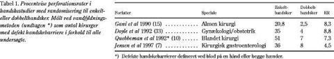 Flere randomiserede studier har vist, at anvendelse af to par handsker (dobbelthandsker) sammenlignet med ét par effektivt reducerer forekomsten af perforationer i handskebarrieren (Tabel 1 ). Selv om det er tvivlsomt, hvorvidt hydrerede handsker tillader passage af mikroorganismer, er det for nylig vist, at anvendelsen af dobbelthandsker tillige reducerer antallet af hydrerede handskebarrierer til omkring det halve (22). Dobbelthandsker anbefales af mange, inklusive sundhedsmyndigheder, som en generel forholdsregel ved operationer (12, 28).