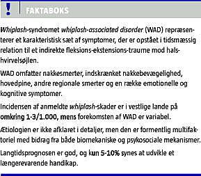 Summary Definition, classification and emidemiology of whiplash Ugeskr Læger 2010;172(24):1812-1814 A whiplash trauma is caused by an acceleration-deceleration force transferring its energy to the cervical spine. Whiplash-associated disorder (WAD) refers to the symptoms that develop after a whiplash injury. The prognosis is favorable with recovery in over 90% of the injured subjects. In a fraction of patients, long-term symptoms with pain and cognitive and emotional symptoms may occur, causing long-term disability. The pathophysiology is unclear. Most research groups favor a multifactorial pathophysiology similar to that observed for other chronic pain conditions without a clear nociceptive or neuropathic component.