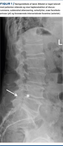 I facetledsartrose indgår både degenerative og proliferative elementer herunder ledspalteafsmalning, subartikulær knoglerosion, subkondrale cyster og osteofytter [17]. I lænden visualiseres facetleddene bedst ved skråoptagelser pga. facetleddenes orientering, dog kan man ved skråoptagelsen kun skelne mellem tilstedeværelse og fravær af facetledsartrose [13]. Laterale optagelser bør tages med patienten stående for at visualisere eventuel instabilitet og sagittalbalance (Figur 1). Med CT demonstreres facetleddene i sekventielle tværsnit med mulighed for supplerende tredimensionelle rekonstruktioner, hvilket optimerer visualiseringen af morfologien og eventuelle strukturelle forandringer af leddet. På trods af at CT er bedre end MR-skanning til vurdering af knoglepatologi, er der moderat til god overensstemmelse mellem resultaterne af de to undersøgelsestyper [18].