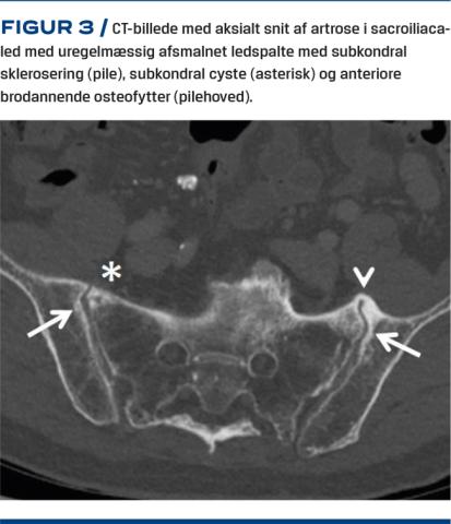 Ved røntgenoptagelse af bækkenet/SI-led kan man påvise sværere grader af artrose i form af osteofytter, sklerosering og ledspalteafsmalning. Pga. leddets lejring er undersøgelsen ikke sensitiv for lettere forandringer. Ved CT påvises der fokal irregulær ledspalteafsmalning, marginale osteofytter, subkondral sklerosering, cystedannelse og vakuumfænomener (Figur 3). Der observeres samme grad af artrose hos patienter med kroniske SI-ledsmerter og raske kontrolpersoner, og CT er ikke valideret til identifikation af symptomatisk SI-ledsartrose [21]. Ved MR-skanning kan man ligesom ved CT påvise uregelmæssig ledspalteafsmalning, osteofytter og forskellige grader af sklerosering [22]. Subkondral eller periartikulær knoglemarvsødem er et hyppigt fund hos patienter, der har kroniske uspecifikke rygsmerter på degenerativ basis [23]. Degenerative forandringer ses hos både aymptomatiske patienter og patienter med kroniske rygsmerter og kan ikke stå alene uden en klinisk vurdering.