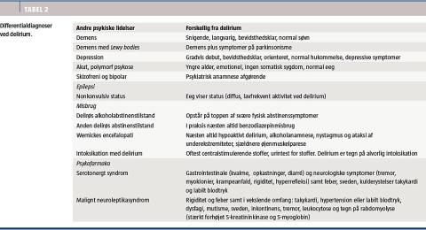 De diagnostiske kernesymptomer ved delirium er vist i Tabel 1. Associerede symptomer kan være de mest dominerende og umiddelbart iøjnefaldende [2, 3]. Afgørende for diagnosen er ofte den akutte debut og det svingende forløb i løbet af døgnet samt forekomst af akut somatisk sygdom eller postoperativ tilstand hos en prædisponeret patient (høj alder, kognitiv svækkelse m.v.). Delirium inddeles i hypoaktivt, hyperaktivt og blandet delirium med fluktuerende hypo- og hyperaktivitet [4, 5]. Karakteristiske forskelle mellem hypo- og hyperaktivt delirium fremgår af Tabel 1. Hallucinationer og vrangforestillinger forekommer hyppigst ved hyperaktivt delirium (ca. 75%), men disse symptomer er også hyppige ved hypoaktivt delirium (40-50%) [4]. En subtype vil i de fleste tilfælde forblive samme subtype under hele forløbet [5]. Det er uafklaret, om subtyperne har forskellig ætiologi, patofysiologi og prognose [2-5]. Delirium bliver ofte underdiagnosticeret i akutmodtagelser, og dette gælder især hypoaktivt delirium [3, 6, 7]. I Tabel 2 er angivet differentialdiagnoser ved delirium.