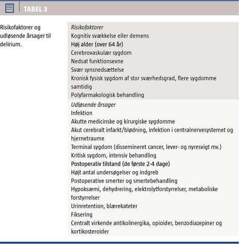 Delirium ses sjældent uden akut somatisk sygdom, forudgående operation mv. [3, 6-8]. Traditionelt skelnes der mellem prædisponerende risikofaktorer og udløsende årsager [3, 6]. Deliriumassocierede faktorer er vist i Tabel 3. Hvis der er svære og prædisponerende faktorer som f.eks. høj alder og demens, kan den udløsende faktor være en banal urinvejsinfektion eller pneumoni.