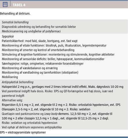 Anbefalingerne til farmakologisk og nonfarmakologisk behandling af delirium er sammenfattet i Tabel 4.