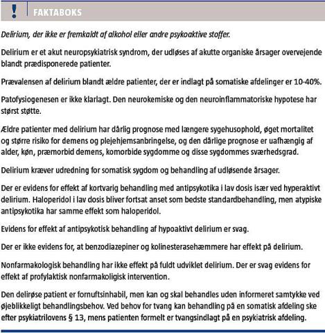 Delirium, der ikke er fremkaldt af alkohol eller andre psykoaktive stoffer, er et akut neuropsykiatrisk syndrom, som opstår af organiske årsager og hyppigt forekommer hos ældre patienter på somatiske afdelinger. Syndromet blev beskrevet af Hippokrates for ca. 2.500 år siden [1]. To syndromer gav han betegnelserne phrenitis og lethargus, hvilket svarer til henholdsvis hyperaktivt og hypoaktivt delirium. Betegnelsen delirium blev indført af den romerske feltlæge Celsus i ca. år 30. Syndromet har haft mange forskellige navne helt op til vor tid. I faglitteraturen fra de seneste 30 år kan der findes mindst 25 forskellige betegnelser for delirium. I 1980 blev begrebet delirium genindført i den amerikanske diagnoseliste DSM-III, hvor der for første gang blev opstillet specifikke diagnostiske kriterier for lidelsen. I ICD-10-diagnoselisten, der blev taget i brug i 1993, er delirium også indført som diagnose.