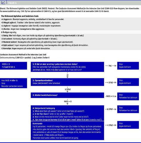 Ely [12] har udviklet og valideret scoringsredskabet The Confusion Assessment Method of the Intensive Care Unit (CAM-ICU) med en specificitet på 89-100% og en sensitivitet på 89-93%. Inden selve deliriumvurderingen vurderes patienternes sedationsniveau med f.eks. Richmond Agitation and Sedation Scale (RASS) [13] (Figur 1 ). Hvis patienten er komatøs (RASS -5) eller dybt sederet (RASS -4), afventer selve deliriumvurderingen af patienten, til han/hun bliver mere vågen. CAM-ICU kan anvendes til intuberede patienter, idet verbal kommunikation ikke er en forudsætning, og testen tager kun få minutter at udføre for læger eller plejepersonale.