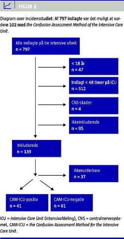 Materiale og metoder: På tre intensivafdelinger blev 139 voksne patienter screenet for delirium med the Confusion Assessment Method for the Intensive Care Uni t (CAM-ICU) fra 48 timer efter indlæggelsen, og indtil de blev overført til andre afsnit eller døde.