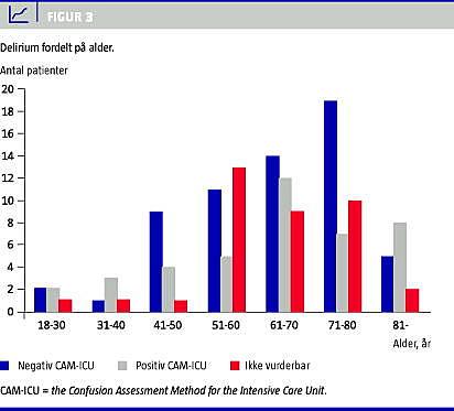 Summary Incidence of intensive care unit delirium in Denmark Ugeskr Læger 2009;171(49):3600-3604 Introduction: Intensive care unit (ICU)-delirium is defined by an acute, fluctuating course. Hallucinations and anxiety are frequent. This patient group experiences increased morbidity and mortality. The incidence of ICU-delirium is reported to range from 16% to 87% in international studies, but until now the incidence in Denmark has remained unknown. Many studies focus on the risk in elderly patients. The aim of this study was to elucidate the incidence of ICU-delirium in Denmark and to describe relations to medication and age. Material and Methods: At three ICUs, a total of 139 adult patients were screened for delirium by the Confusion Assessment Method for the ICU (CAM-ICU) from 48 hours after admission and until they were transferred to another ward or died. The CAM-ICU takes into account the sedation level of the patient and is applicable even if patients are in a respirator. Results: A total of 41 patients (29.5%) had at least one positive score for delirium, 61 (43.9%) never had a positive score and 37 (26.6%) were too sedated throughout their stay at the ICU to be scored. Thus, the incidence for ICU-delirium was 40.2% among patients eligible for scoring by the CAM-ICU. Lightly sedated patients (with or without medication) had a 10-fold increased risk of ICU-delirium. Age was not associated with any difference in incidence. Patients were mostly unsedated when scored to have delirium; no sedation medication significantly increased ICU-delirium. Fentanyl used as analgesic showed an increased relative risk of 4.79. Conclusion: ICU-delirium is common and occurred in all age groups in the present study.