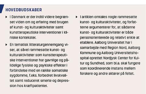 Den stigende internationale forskning i brugen af kunst- og kulturaktiviteter i kliniske kontekster dokumenterer en række gavnlige effekter i forbindelse med mange sygdomme og diagnoser [1, 2]. Ved en tematisk litteraturgennemgang er der fundet et stort antal undersøgelser, der viser, at kunst- og kulturtiltag samt kunstbaserede interventioner har givet positive og pålidelige kliniske og psykologiske resultater [3]. I denne artikel vil vi præsentere udvalgte resultater fra den tematiske litteraturgennemgang og diskutere værdien af kunst- og kulturaktiviteter som kliniske, terapeutiske og rammesatte tiltag, ligesom vi vil sammenfatte evidensen for disse aktiviteter og interventioner til sundhedsfremme.
