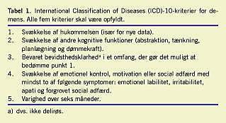 Et individs samlede funktionsevne kan - for simplificeret, men klinisk særdeles praktisk - opsplittes i en kognitiv funktionsevne (intellekt) og en fysisk funktionsevne (mobilitet). Ved kognitiv dysfunktion forstås nedsat funktion inden for områder som indlæring, hukommelse, strukturering, overblik, problemløsning, sprog og tænkning. Det er en dysfunktion af de hjerneprocesser, som foregår mellem en opstået situation og reaktionen herpå [4]. Demens er derimod en syndromdiagnose, hvor alle fem The International Classification of Diseases and Related Health Problems (ICD)-10-kriterier skal være opfyldt (Tabel 1 ). Man kan godt være kognitivt dysfungerende uden at være dement, men ikke omvendt. Kognitiv dysfunktion er altså et videre begreb end demens. På et tredje og ætiologisk niveau findes de forskellige typer af demenssygdomme.
