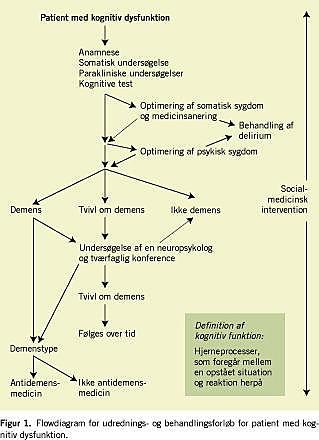 Figur 1 viser på en skematisk måde patientens udrednings- og behandlingsforløb. Patienten henvises med uafklaret kognitiv dysfunktion og først når alt, som kan sløre billedet (reversibel demens og pseudodemens), er diagnosticeret og behandlet, kan den kognitive dysfunktion tages som et udtryk for en irreversibel demenssygdom. Læg mærke til at den socialmedicinske intervention begynder ved den første konsultation og finder sted i hele patientforløbet.