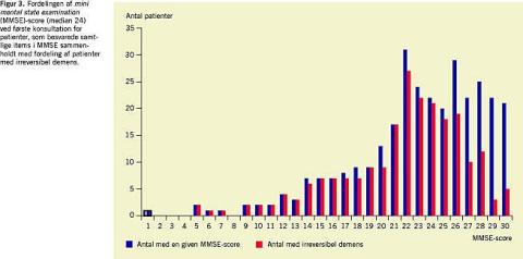 Spredningen i MMSE ved første konsultation viser, at patienterne overvejende blev henvist med en MMSE-score på over 20, og at patienter med selv meget høje MMSE-scorer godt kan have en irreversibel demenssygdom. Det understreger vigtigheden af at indhente en sufficient anamnese, da velbegavede patienter alt andet lige typisk scorer højere ved MMSE end knap så velbegavede patienter gør. Ved meget lave MMSE-scorer kan den kliniske problemstilling være, at pårørende ikke er blevet informeret om eller helt har forstået, hvad der er årsagen til den svære kognitive dysfunktion. Det kan også dreje sig om demensudløste adfærdsforstyrrelser, som kan bedres gennem adfærdsændringer hos pårørende eller plejepersonale.