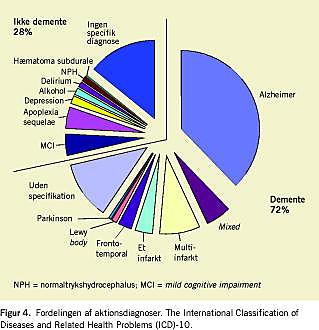 Hvad angår fordelingen af aktionsdiagnoser, fik 72% af de henviste patienter stillet diagnosen irreversibel demens. Hejl et al [5] fandt i en undersøgelse fra H:S Hukommelsesklinikken, Rigshospitalet, at 43% af 1.000 konsekutive patienter opfyldte DSM-IV-demenskriterierne, og at der i denne undergruppe var 4% med en potentielt reversibel årsag. Den mest sandsynlige forklaring på differencen er forskelle i gennemsnitsalderen på de henviste patienter på henholdsvis 84 år (median) og 66 år. Johannsen et al [6] fandt tilsvarende i en undersøgelse af 110 konsekutive patienter, som også blev udredt på en Hukommelsesklinik i neurologisk regi, at kun 47% opfyldte ICD-10-demenskriterierne. Måske er tærsklen for at henvise til udredning for lettere kognitive dysfunktioner lavere for yngre end for ældre patienter.