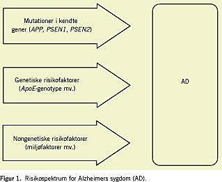 I tvillingestudier har man påvist, at genetiske faktorer spiller en rolle også ved sporadisk Alzheimers sygdom. Foruden de tre gener, der er associeret med tidligt debuterende auto-somal dominant arvelig Alzheimers sygdom, har man ved associationsstudier påvist ApoE -genotypen som en risikofaktor for sporadiske sent debuterende tilfælde af sygdommen [6]. ApoE -genet er beliggende på kromosom 19 og koder for apolipoprotein E. Den risikogivende allel betegnes ε4 . Det skal dog understreges, at ApoE -genotypen ikke kan anvendes i rådgivningsmæssig eller diagnostisk sammenhæng, idet ε4 -allellen hverken er en nødvendig eller tilstrækkelig faktor for udvikling af sygdommen (Figur 1 ).