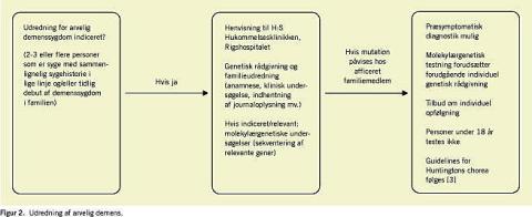 Molekylærgenetisk diagnostik af Huntingtons chorea foretages på flere laboratorier i Danmark, mens sekventering af generne APP , PSEN1 , PSEN2 og MAPT kun foretages på Molekylærgenetisk Laboratorium på H:S Rigshospitalet efter henvisning fra H:S Hukommelsesklinikken på Rigshospitalet (Figur 2 ).